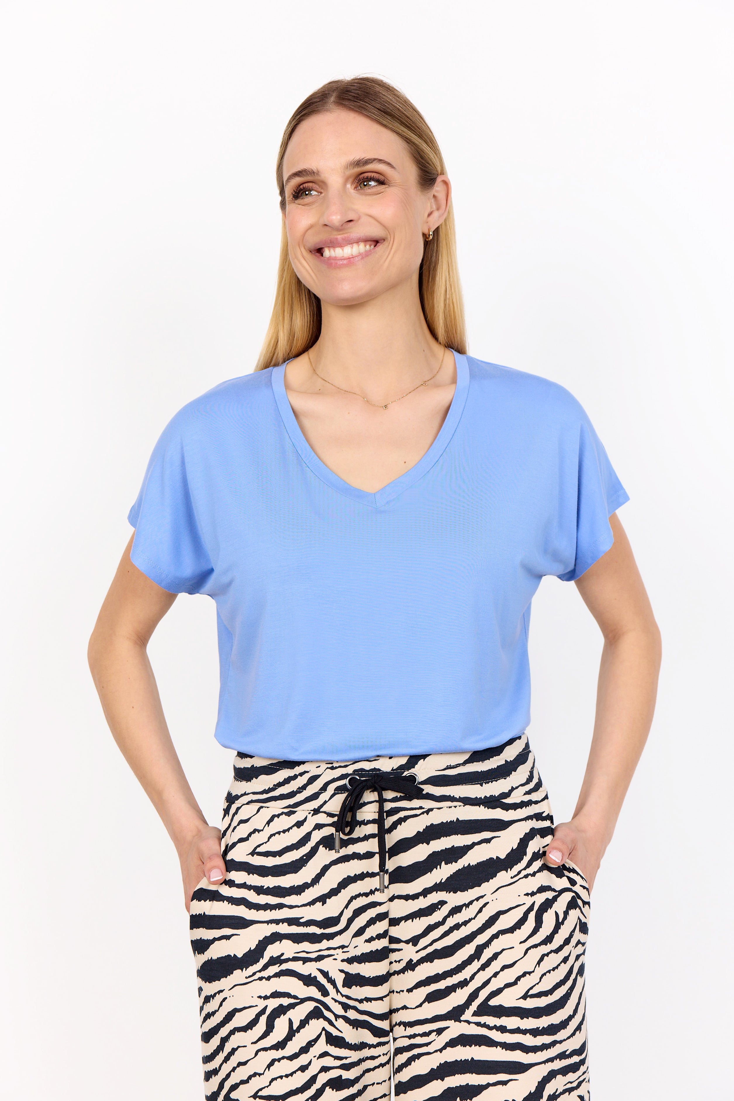 MARICA 32 t-shirt fra SoyaConcept er er en basis t-shirt i en lyocell og elasthan kvalitet. Den har en klassisk pasform og en blød v-halsudskæring. Style den med en blazer og et par habitbukser for et klassisk udtryk.