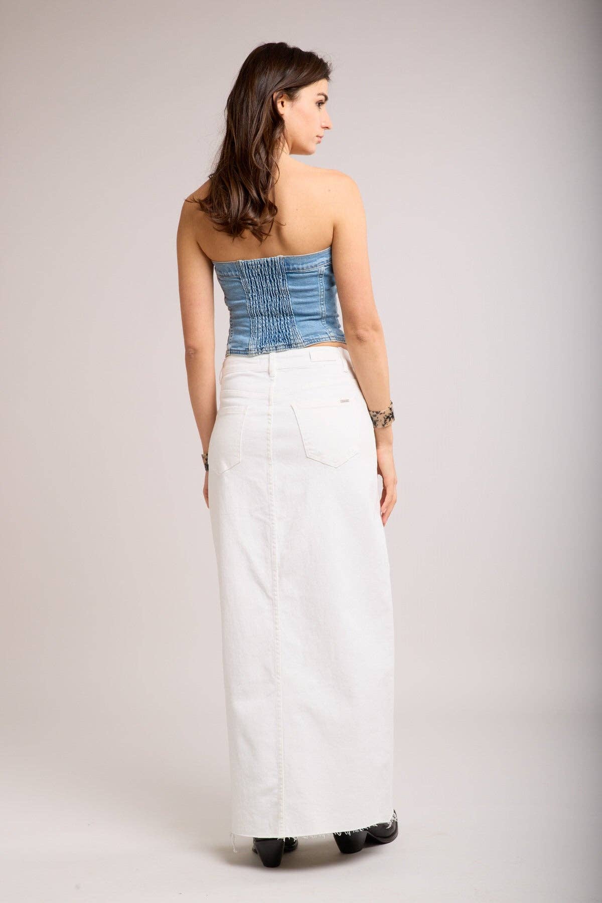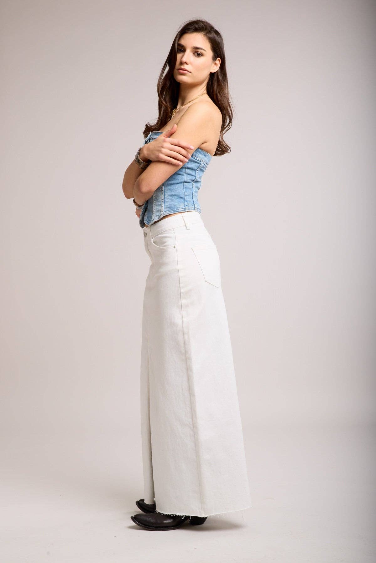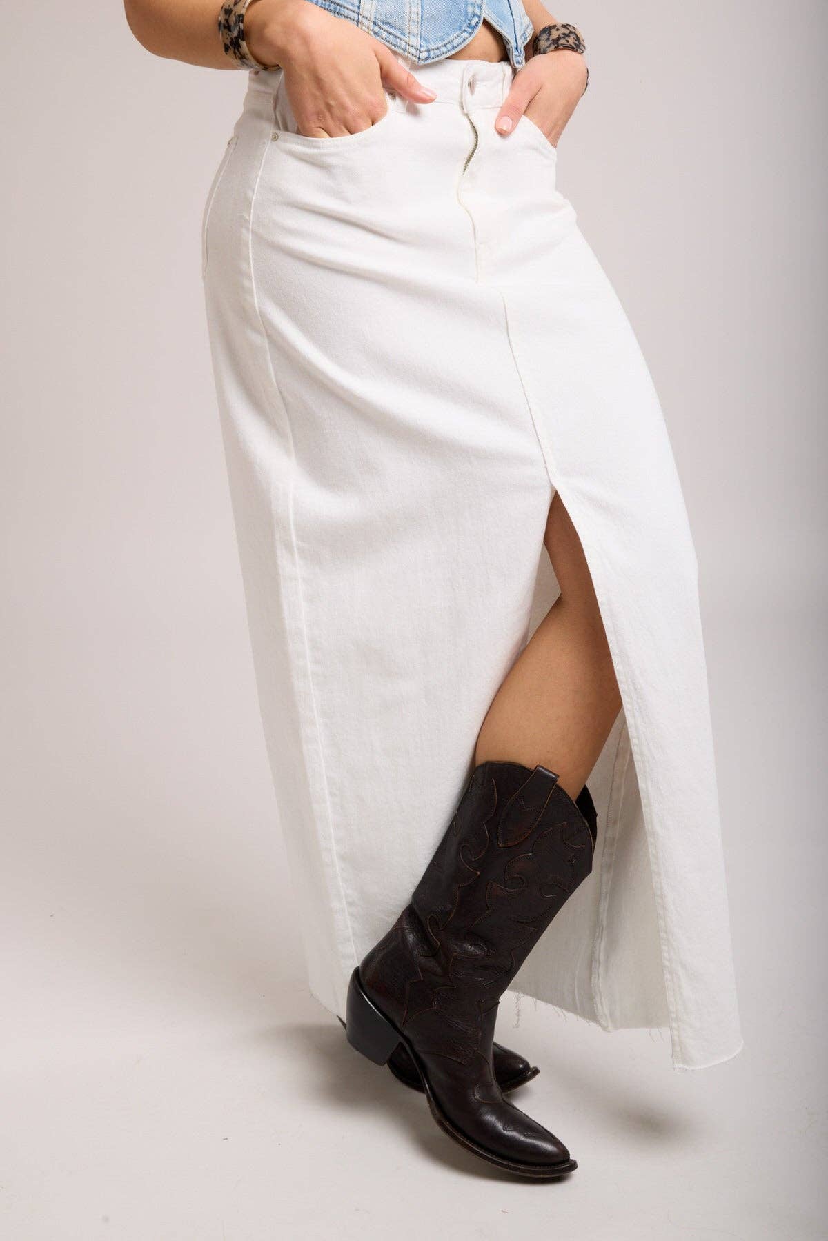 PAULINE kombinerer det rå og elegante look i denne lækre nederdel. Den har knap og lyslås, bæltestropper, for- og baglommer ligesom en klassisk jeans. Slids foran og de rå kanter forneden, giver nederdelen et twist. Komfortabel stretch giver en god pasform.