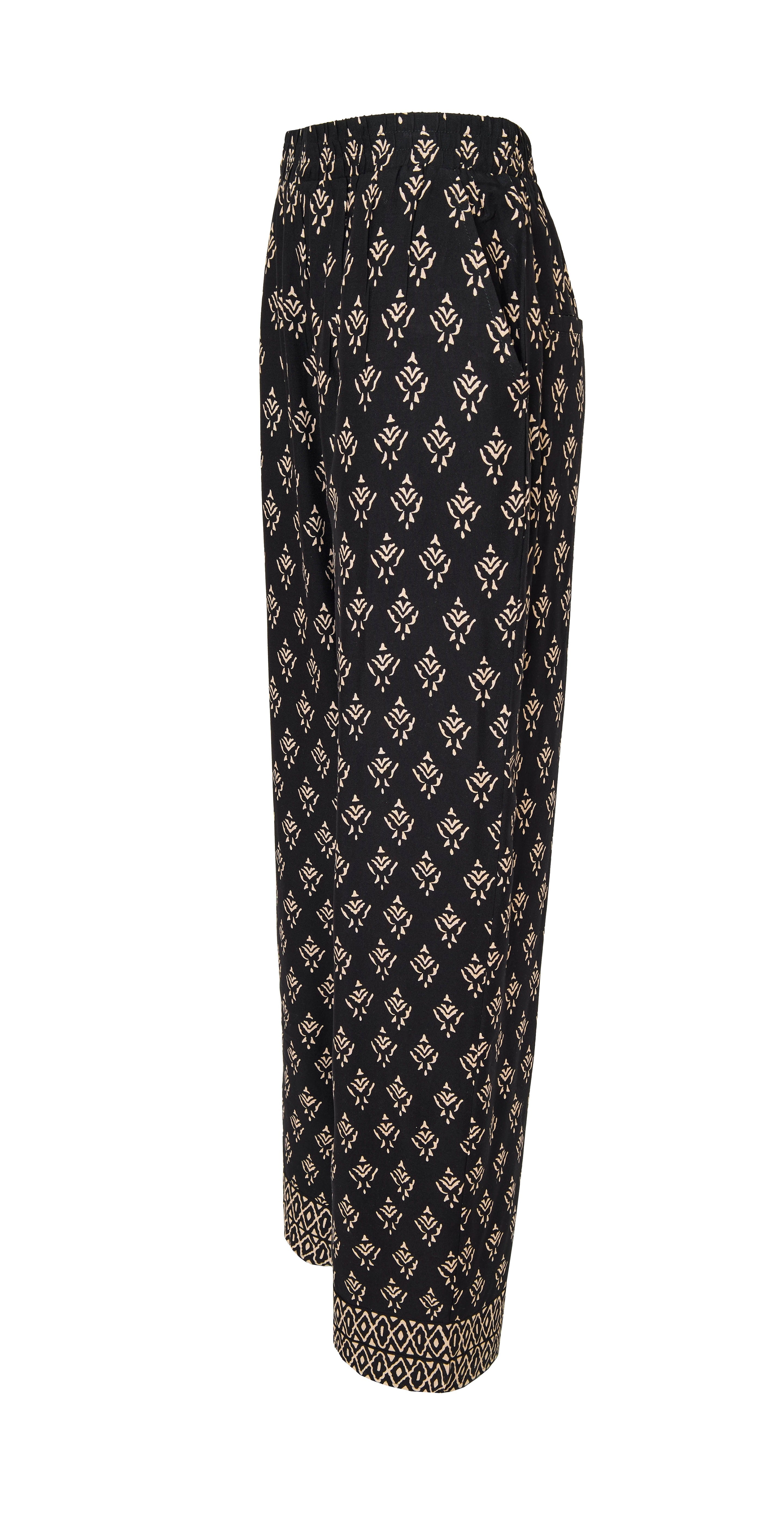 Bukserene er med brede ben, bred elastik i livet og lommer i siden.