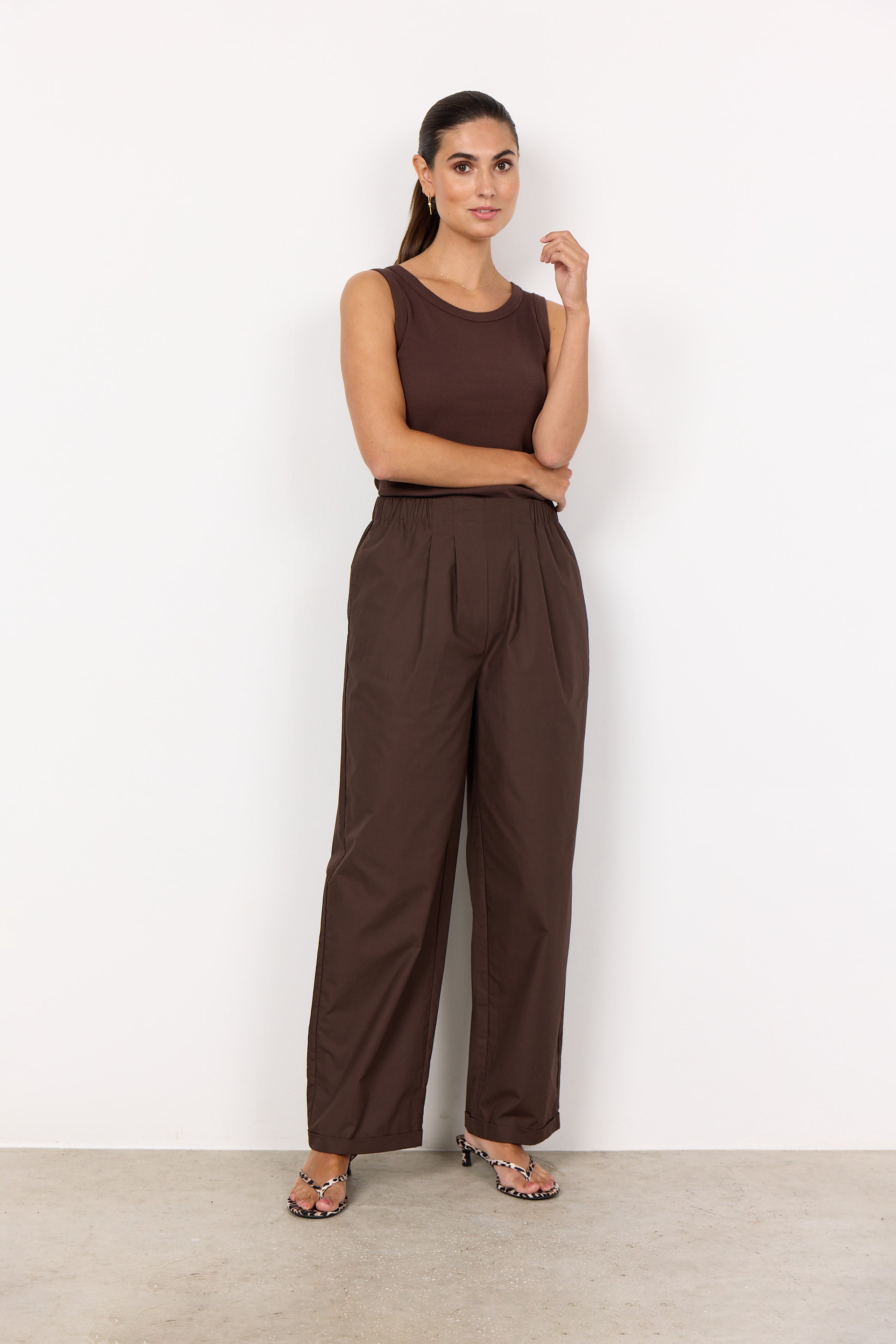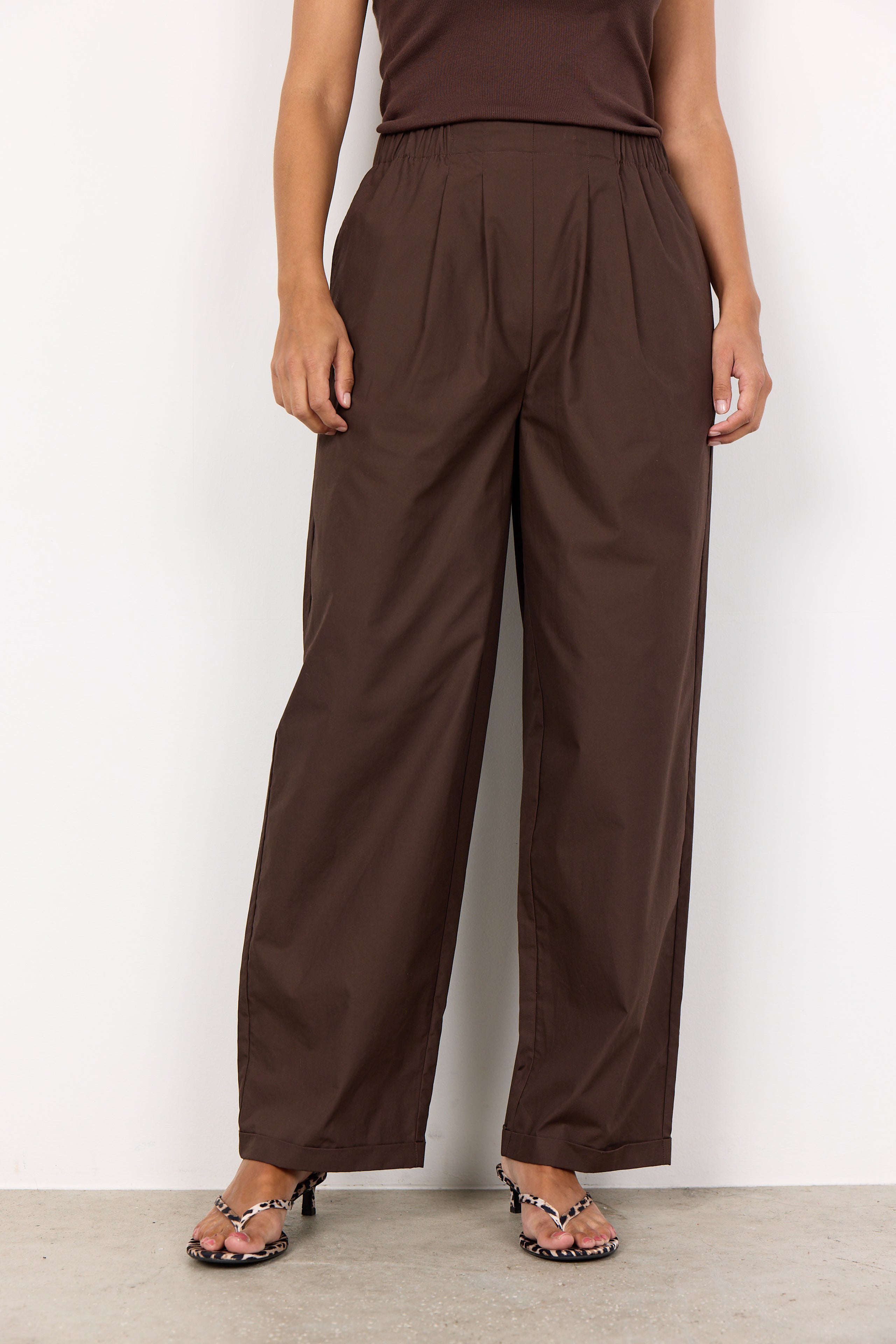 • RACHELLE  bukser fra SOYACONCEPT er et behageligt og stilfuldt valg, fremstillet af 100 % økologisk bomuld. Bukserne har en afslappet pasform med lægdetaljer og et design med brede ben samt en elastisk talje, der gør dem nemme at have på.