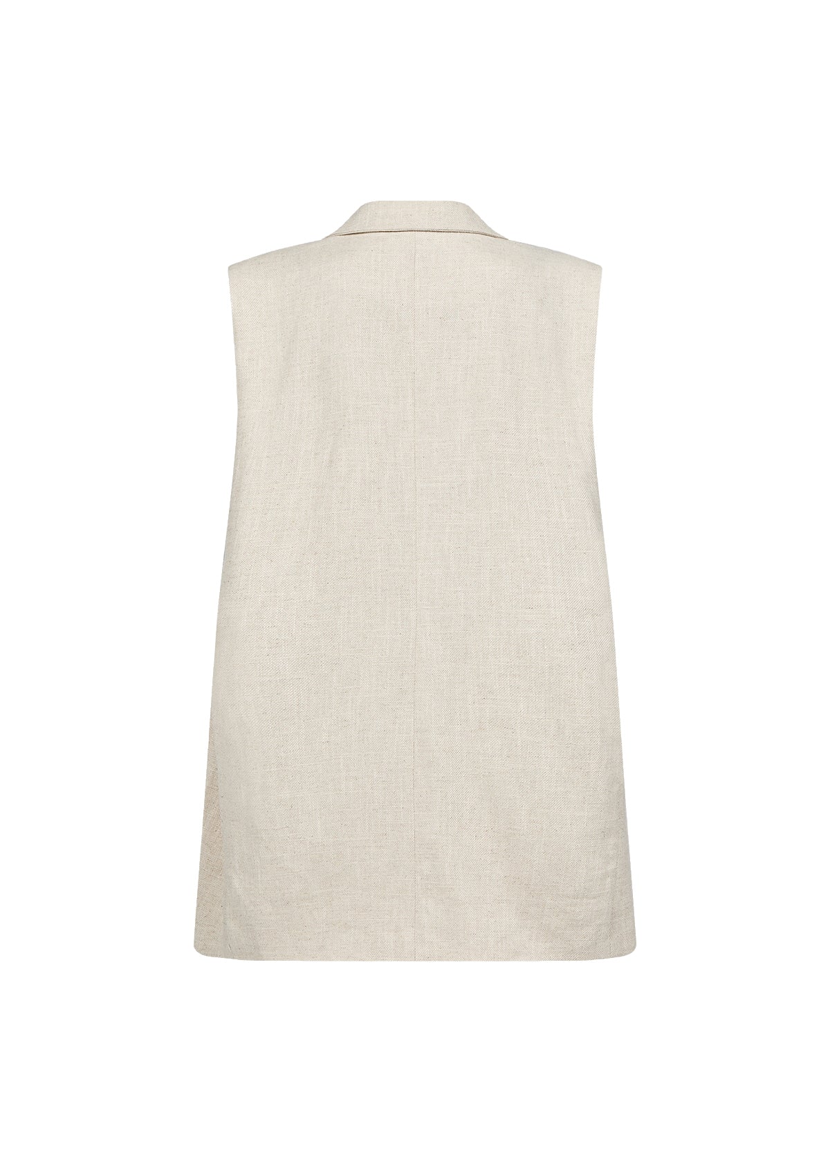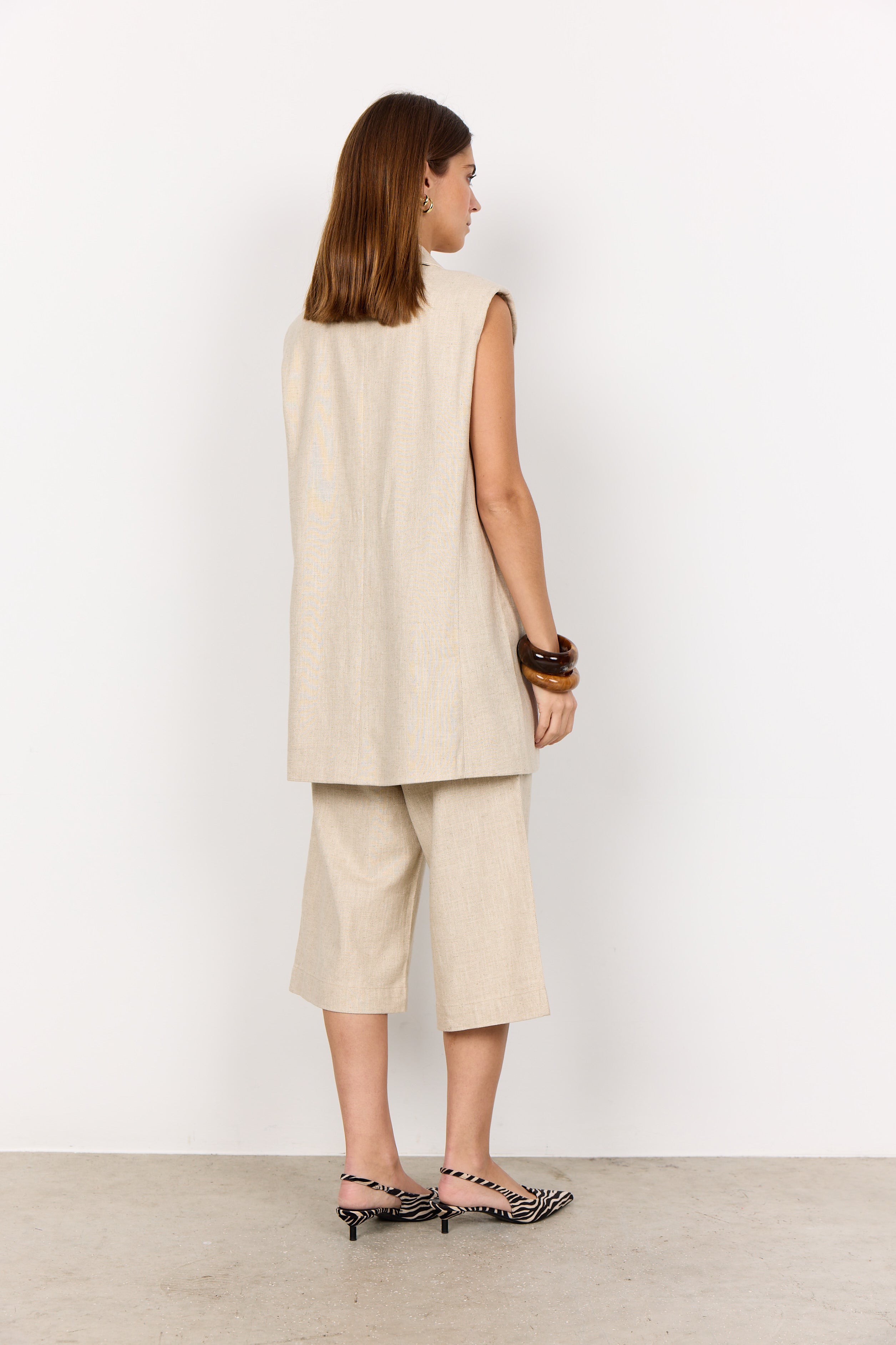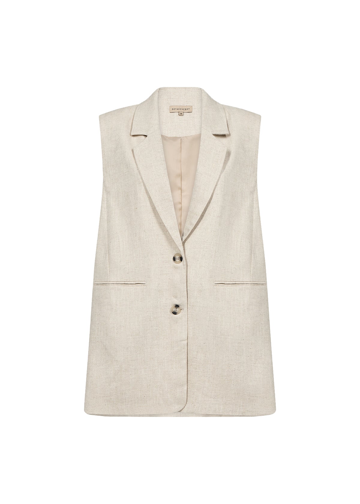 SIMI 1 vest fra SOYACONCEPTer en vest bestående af en blanding af 37% bomuld, 37% rami og 26% hør. Vesten har krave med indhak, lukning med to knapper og to lommer foran.