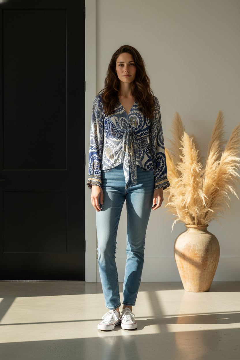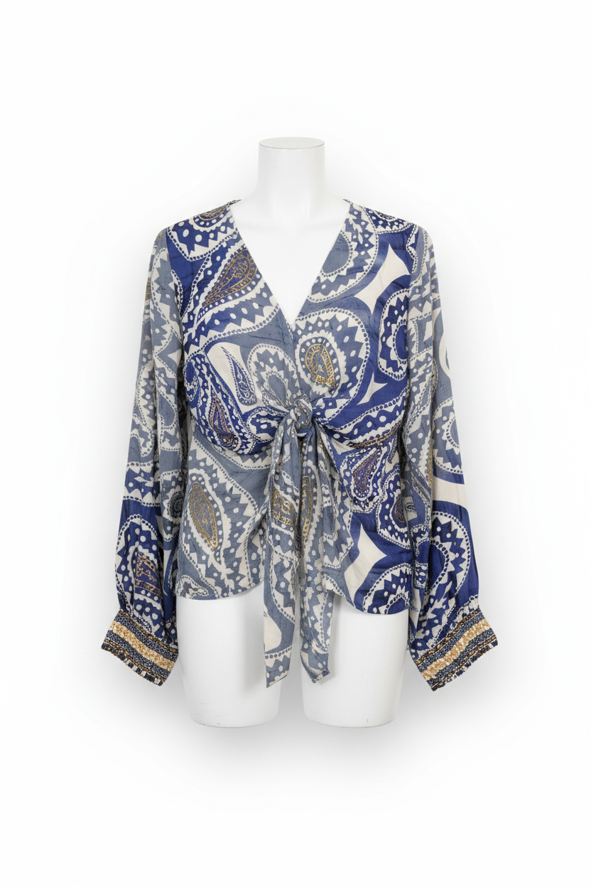 VEGA BLUSE fra Wilto. Lækkert print i blå/guld nuancer. En rigtig fin bluse med flotte detaljer med bindebånd i taljen og smok ved ærmet.