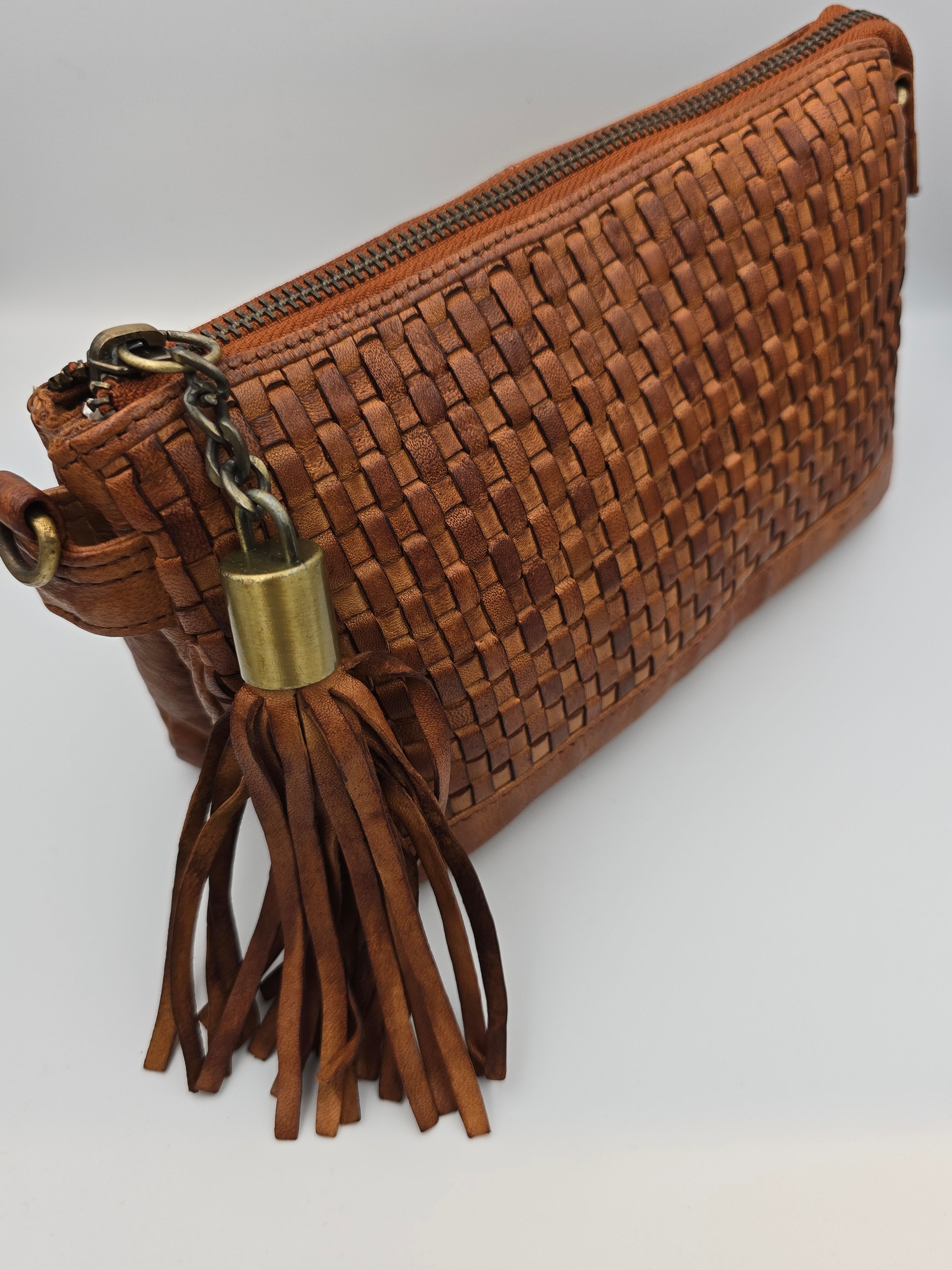 Smuk taske i skind med flet foran. Tasken har to store indvendige rum, en lille lynlåslomme samt en lille kortlomme. Dekorativ kvast på lynlåsen.