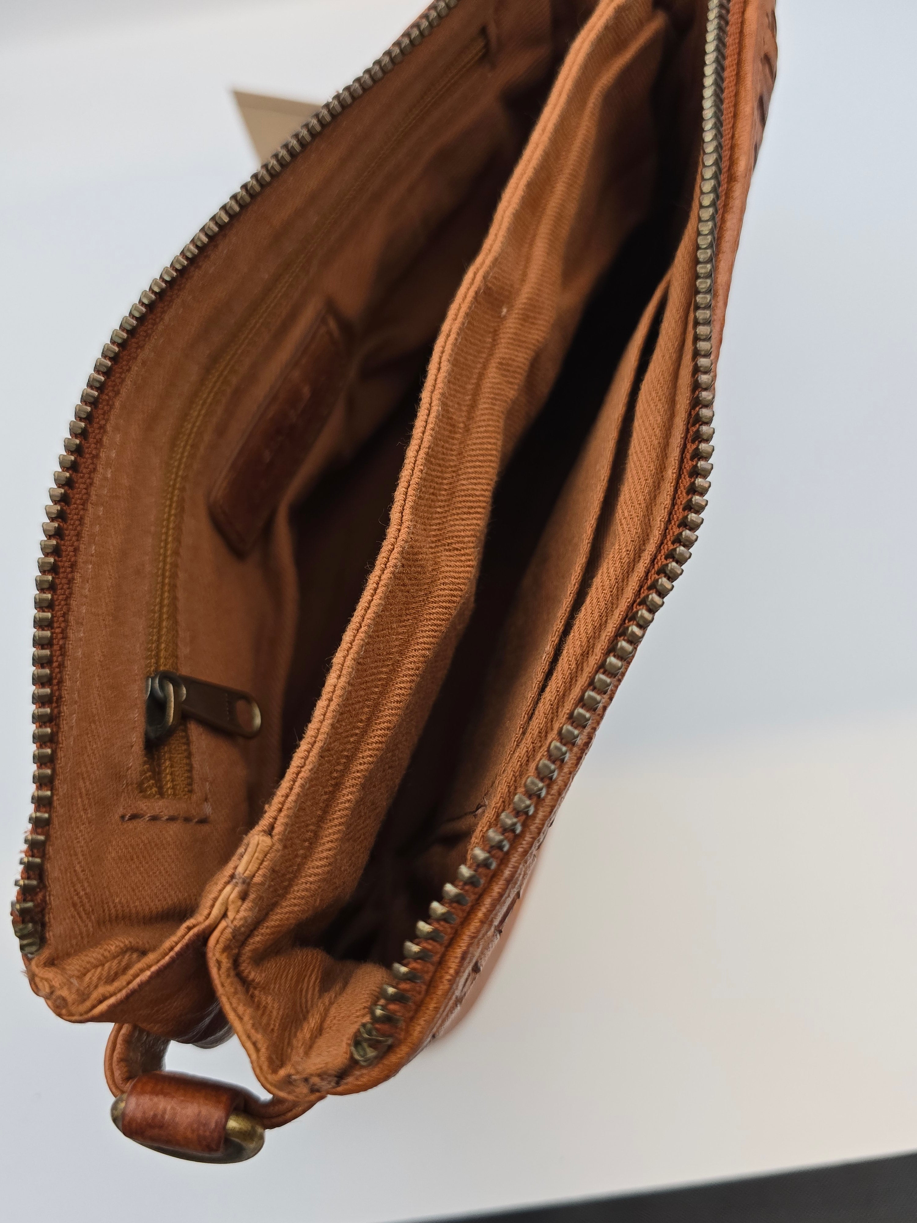 • Smuk taske i skind med flet foran. Tasken har to store indvendige rum, en lille lynlåslomme samt en lille kortlomme. Dekorativ kvast på lynlåsen.